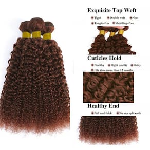 Descrição do cabelo humano: 1. Typer de cabelo: trama de cabelo humano virgem brasileiro. 2. Cor do cabelo: Pacotes de cor nº 33, mechas marrom avermelhado. 3. Cachos de cabelo: cabelo humano encaracolado marrom mechas 4. Peso do cabelo: 3 feixes, 100 g/pacote, 300 g no total. 5. Material do cabelo: mechas de cabelo humano virgem brasileiro, sem mistura química. 6. Pode ser permanente: pode ser ondulado profundamente como você desejar, mas tenha cuidado para não exceder 51,7 °C. Perguntas e respostas: P1: Quantos mechas eu preciso para uma cabeça inteira? R1: Normalmente, 3 mechas são suficientes para fazer uma cabeça inteira, mas se você quiser parecer mais longo ou mais cheio, 4 mechas podem ser uma escolha melhor. P2: Vai cair? R2: Para novos mechas de cabelo, é normal perder alguns fios de cabelo no início, assim como nosso próprio cabelo. O cabelo é trama dupla à máquina para evitar quedas. A queda de cabelo pode ser causada por muitas coisas. Danos causados pelo calor de secadores, chapinhas e chapinhas, bem como a coloração resultarão em quebra. P3: Como cuidar do cabelo? R3: Limpe regularmente a sujeira e hidrate com xampu e condicionador, penteie seu cabelo com um pente de dentes largos todos os dias. Desembarace o cabelo suavemente antes de lavar. Não esfregue ou torça. Retire o excesso de água com uma toalha e deixe o cabelo secar naturalmente. Não exponha ao sol. - Material do cabelo: mechas de cabelo virgem brasileiro, trama de máquina dupla; é natural e saudável, macio e volumoso; sem embaraços, sem piolhos, cheio e grosso - Cor do cabelo: marrom avermelhado, 33 cores; brilhante e bonito, pode ser esticado, enrolado, descolorido, estilizado como seu próprio cabelo; uso confortável, pode ser tingido, permanente, destacado ou estilizado adequado para o dia a dia - Vantagem: limpo e saudável, livre de emaranhados e sem queda; trama dupla reforçada, acabamento requintado; natural e confortável, macio e brilhante; sem qualquer divisão, não seca, fácil de cuidar, não machuca seu couro cabeludo - Comprimento do peso do cabelo: um pacote tem três feixes, e o peso de um único pacote é de 100 g; várias opções, não importa o cabelo curto ou longo que você goste, dependendo de suas necessidades; para o comprimento, estique o cabelo para ficar liso e depois meça - Adequado para todos os tipos de ocasiões: você pode usar mechas de cabelo humano em qualquer ocasião, por exemplo, festa, Halloween, festival, show de palco, Natal, escola, férias, uso diário, mantém você bonita e charmosa