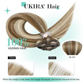 Ukira blonde destaca extensões de cabelo. Feito de cabelo humano Remy. Tanto o brilho quanto a suavidade são indistinguíveis do seu cabelo natural. Eles se misturam perfeitamente com a cor do seu cabelo para criar seu volume ou comprimento ideal. É muito macio e sedoso. Você pode enrolar, secar e alisar como seu próprio cabelo.