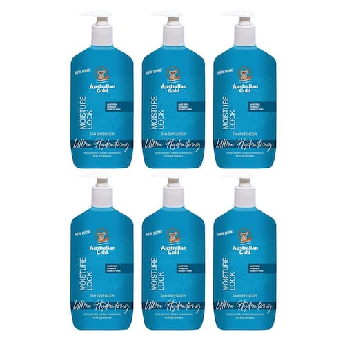Australian Gold Extensor de bronzeamento úmido 473 ml (473 ml) (pacote com 6) - 6 peças - 473 ml - Bloqueia a umidade, o que ajuda a manter o bronzeado por mais tempo - Contém Aloe Vera, extratos nativos australianos - Pantenol e vitamina E - Levemente perfumado