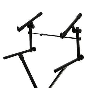 'Com este suporte de encaixe universal, este extensor com regulagem de altura e ângulo é perfeito para adicionar múltiplos teclados a suportes de estrutura tubular. Esta ferramenta universal pode ser encaixada acima de um suporte com 2 teclado, tornando-se um extensor para 3 teclado|