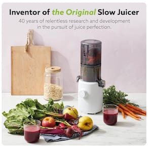 Funil de autoalimentação V2 O H310 Slow Juicer vem com um funil de autoalimentação atualizado que é menor que o do H200, mas ainda acomoda frutas inteiras. Pequeno e leve com um diâmetro de apenas 4 polegadas e peso inferior a 8 libras, o H310 ocupará pouco espaço e não sobrecarregará as mãos. Qualidade e durabilidade Feito de um corpo de plástico ABS livre de BPA e resistente a impactos, nossos Slow Juicers são projetados para uso diário e são extremamente duráveis. Além disso, o filtro Ultem e o sem fim reforçados do H310 são 8 vezes mais fortes do que os plásticos tradicionais. Segurança Como em qualquer outro Hurom Slow Juicers, o H310 Slow Juicer é feito de todos os materiais livres de BPA. Câmara sem filtro O H310 apresenta um mecanismo revolucionário sem filtro. O filtro é praticamente embutido dentro da câmara e o sem fim de duas partes se encaixa para coar o suco sem polpa o que significa limpeza mínima para suco de alta qualidade Tecnologia Slow Squeeze Emulando o processo de compressão manual real, o H310 Slow Juicer gira a uma velocidade de apenas 43 rotações por minuto. A exclusiva e patenteada tecnologia Slow Squeeze da Hurom mantém seu suco em seu estado mais natural, mantendo se fresco por mais tempo. Rendimento Nosso sem fim exclusivo de baixa velocidade extrai até a última gota de suco possível de frutas e vegetais, deixando para trás uma polpa seca e toda a bondade em seu copo.