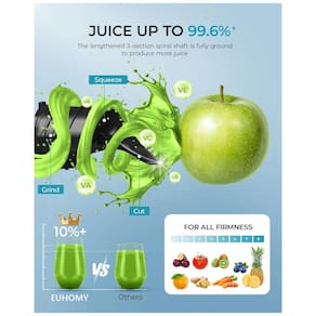 As Máquinas de Extrair Sucos com design compacto e Boca de Alimentação Grande da EUHOMY se destacam entre as máquinas de extrair sucos, projetadas com uma boca de alimentação extra grande de 14,5 cm e um espaçoso recipiente de 1,7 litros. Este extrator de sucos a frio permite extrair sucos de frutas e vegetais inteiros como maçãs, cenouras, aipo e gengibre sem a necessidade de cortar. Com a tecnologia avançada das máquinas de extrair suco a frio, ele preserva mais nutrientes e cria sucos suaves e sem espuma. O filtro de dupla camada garante suco puro, tornando-o ideal para vegetais de folhas verdes e frutas. A separação de suco e polpa é eficiente e limpa, perfeita para aipo, vegetais de folhas verdes e produtos duros. Com uma operação simples de um toque e uma função reversa para evitar entupimento, este extrator de sucos elétrico oferece até 99,6% de rendimento de suco, tornando-o um poderoso extrator de sucos para todos os tipos de produtos. Fácil de montar e limpar, este extrator de sucos é ideal para quem busca praticidade ao extrair sucos de vegetais e frutas. Cada máquina de extrair suco da EUHOMY é feita com materiais duráveis de qualidade alimentar e um design moderno e compacto. Os componentes-chave são aprimorados com acabamentos em aço inoxidável para maior durabilidade. Com dois copos de suco, uma escova de limpeza e suporte total, este extrator de sucos é tudo que você precisa em um extrator de sucos profissional. Seja para shots detox ou suco de laranja fresco, esta máquina de fazer sucos oferece resultados consistentemente superiores. Tudo isso em um dispositivo que é fácil de limpar, eficiente e durável.