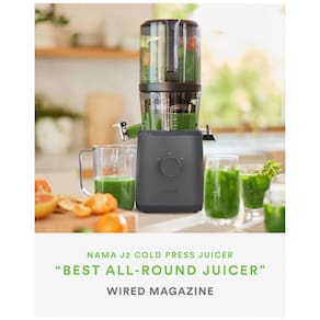 Extrator de Sucos Nama J2 Cold Press Automático com Alimentação Automática para Operação sem as Mãos e Boca Larga para Carregar Receitas - Extrator de Sucos Cold Press Automático