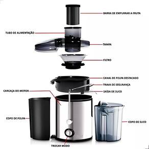 Extrator de sucos e vegetais ShopMix com 2 velocidades, potência de 1500W, sistema anti-gotejamento, pés de borracha e controle de aquecimento. Possui coletor de polpa de 1 litro e jarra de 500ml. Livre de BPA.Motor c/ dupla rotação