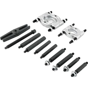 1 Conjunto extrator de rolamentos com 12 peças, sendo: 1 extrator 30 - 50 mm, 1 extrator 50 - 75 mm, 1 parafuso de impulso, 2 barras de extensão 105 mm, 2 barras de extensão 130 mm, 2 barras de conexão 105 mm, 2 barras de conexão 130 mm e 1 barra transversal tipo H.