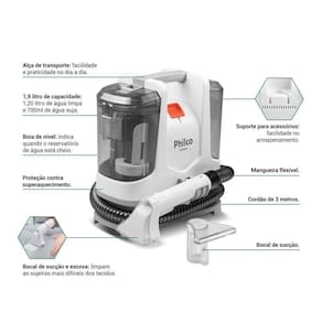 Além disso, ela conta com reservatório de 1,9 litro, 1600w de potência, dois bocais de sução e acessório escova para limpar as sujeiras mais difíceis dos tecidos. É 2 em 1, Extrator e spray de água, possui alto poder de sucção para extrair as sujeiras mais profundas em tapetes, carpetes, sofás, colchões e estofados.