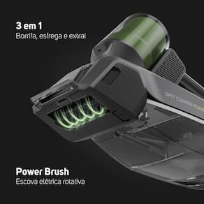 Possui 3 funcionalidades em 1: você pode borrifar, esfregar e extrair, em um único movimento, mas seu principal diferencial é a escova elétrica rotativa, que esfrega a superfície para soltar a sujeira que está incrustrada, garantindo uma limpeza profunda em estofados, tapetes, bancos de carros e carpetes.