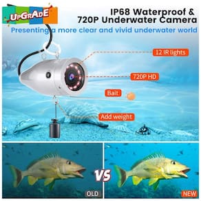 Câmera de pesca subaquática Eyoyo Este é o localizador de peixes de vídeo portátil atualizado da Eyoyo. Câmera AHD 720p atualizada tela IPS 1024x600 de função DVR, traz para você um mundo subaquático mais distinto e realista. Câmera AHD 720p atualizada Em comparação com a antiga câmera 1000TVL, a nova câmera com resolução de 1280x720 torna as imagens mais claras e as cores mais vivas. Função DVR atualizada Comparado com a versão antiga, os vídeos devem ser reproduzidos por um player de terceiros, este atualizado pode ser aberto diretamente no navegador ou telefone celular e compartilhado diretamente. E um cartão de memória de 8GB está incluído. 12pcs IR Lights Estas 12pcs IR Lights fornecem uma fonte de luz imperturbável se a luz for fraca debaixo dágua, permitindo que você observe os peixes no escuro. Observe a imagem ficará preta e branca no escuro quando as luzes IR estiverem acesas e as luzes podem ser desligadas desconectando o conector Marca: Não Informado