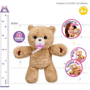 Envolva-me no meu cobertor e acalme-Me para dormir! Bolhas A aconchegante soneca é tão macia e fofa que faz o melhor amigo para dormir! Use minha chupeta para me mandar dormir! Agrade-me e eu vou fechar meus olhos e começar a rir! Pet minha cabeça! Eu reajo e respondo ao seu toque! Eu estou tão vivo! Eu tenho mais de 25 sons e reações!