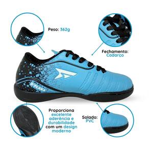 -Marca: D’Plaka Oficial -Tipo: Chuteira Futsal -Cabedal: Material sintético, que proporciona durabilidade e um visual moderno. -Fechamento: Cadarço tradicional para ajuste firme -Solado: Em PVC, com boa flexibilidade, durabilidade, aderência ao solo e resistência ao desgaste. -Design: Cor azul com detalhes em preto e logo da marca D’Plaka na lateral e na língua, trazendo um visual esportivo e estiloso. -Indicação de uso: Esporte indoor/futsal – uso infantil. -Palmilha: Macia e removível, contribuindo para o conforto e facilitando a higienização.