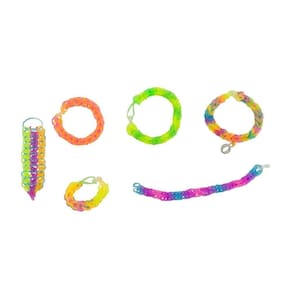 Contém: Tear plástico, 1 Gancho, 600 elásticos que brilham no escuro, 77 pingentes de letras (2 letras de cada letra do alfabeto MAIS 5 para cada vogal (A,E,I,O,U) e 24 peças em forma de fecho.
