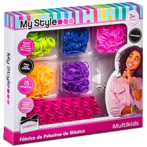 Faça suas próprias pulseiras com muito mais facilidade e estilo A Fábrica de Pulseiras de Elástico Clássico My Style é ideal para exercitar a criatividade e desenvolver habilidades manuais das crianças. O brinquedo vem acompanhado de um manual com um passo a passo e diversas inspirações.