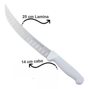 Faca Butcher 10 Churrasco Curvada Mundial Grande Granton A faca Carne Masterline Mundial é produzida com lâmina temperada em aço inox, o que garante maior resistência, sem sofrer danos durante as afiações. O cabo em polipropileno virgem é altamente resistente ao uso diário. É ideal para cortar carne crua, assada e cozida.