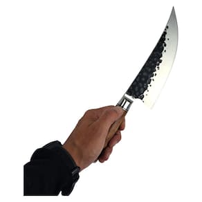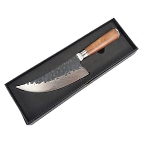 A faca possui um cabo de madeira e uma lâmina de aço inoxidável com marcas decorativas. Essa faca é versátil e adequada para uma variedade de tarefas na cozinha. Com seu cabo confortável e lâmina afiada, ela proporciona um manuseio preciso e seguro.