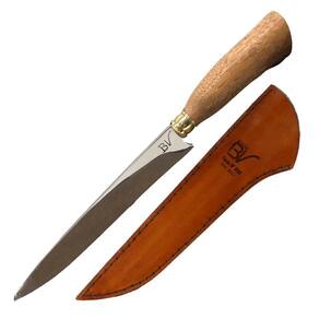 • 1 Faca 1 Bainha em couro de búfalo costurada a mão 1 Registro de propriedade 1 Manual de recomendação de uso
