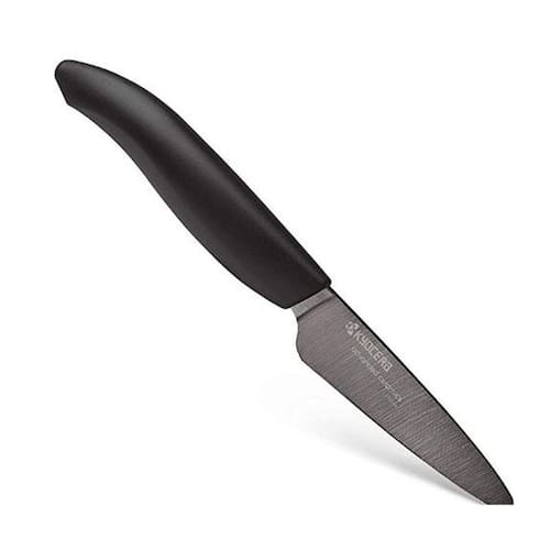 Faca Ceramica Kyocera - Lamina Negra 3.0 Cabo Preto As facas de Cerâmica Avançada Kyocera fabricadas em Zircônia, o óxido de zircônio é extremamente rígido, resistente ao desgaste e quimicamente inerte, para os técnicos, o óxido de zircônio tem uma rigidez de 8.2 mohs vs. Aço em 56 mohs e diamante em 10mohs . Além da resistência ao desgaste, as facas de cerâmica Kyocera são quimicamente neutras, fazendo com que os alimentos conservem a aparência e sabores . A sua superfície polida resiste a germes e bactérias além de não sofrer com a ação de ácidos, óleos e sais, são de limpeza muito fácil, simplesmente lave e seque. Com a metade do peso de uma faca equivalente de metal a faca de cerâmica é perfeitamente balanceada, tornando a confortável para seu uso, reduzindo a fadiga e esforço para cortar e fatiar os alimentos. Todas as facas perdem o fio com o tempo, sendo que a cerâmica estará mais afiada no início e permanece afiada por muito mais tempo. Com o tempo poderá notar pequenas lascas no fio da lâmina, trata-se de um processo normal pelo qual as lâminas de material duro perdem o fio. Comprimento 26 Largura 6 Altura 3 Peso 95 g Marca: Não Informado Ean: 4960664554362