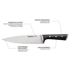 Não perca a oportunidade de adquirir a Faca Chef Aço Inox Tefal 20cm Ice Force e desfrutar de uma experiência culinária superior. Com sua ponta curvada, lâmina resistente e cabo ergonômico, você terá uma faca confiável e de alta qualidade para facilitar suas atividades na cozinha.