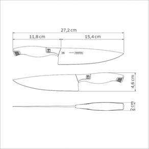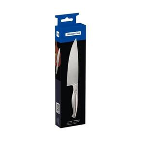 Modo de Uso: Para maior durabilidade do produto recomenda-se secar bem antes de guardar, mesmo após lavagem em máquina. Recomenda-se o uso de tábuas de polipropileno ou madeira da Tramontina para maior durabilidade do fio da faca. Não é indicado o uso da faca para o corte de alimentos congelados. Para descarte dos produtos e embalagens siga as orientações de reciclagem vigentes.