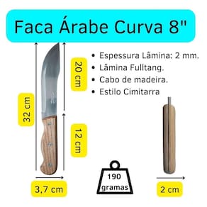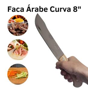 Faca 8'' modelo árabe com desenho estilizado de cimitarra, bom efeito visual e ótima para cortar carnes. Indicada tanto para quem corta na tábua quanto no espeto.