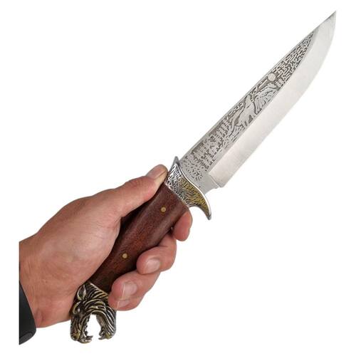 Tipo: Faca Full Tang Material da Lâmina: Aço decorado em alto-relevo Material do Cabo: Madeira com acabamento em cabeça de lobo Comprimento Total: 33 cm Comprimento da Lâmina: 18 cm espessura: 4 mm Comprimento do Cabo: 14 cm Peso: 400 g Uso: Camping, churrasco e decoração