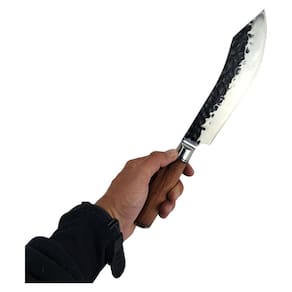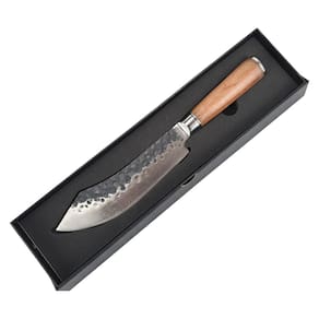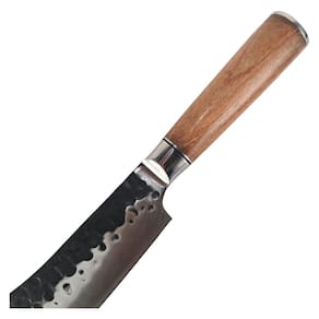 A faca possui um cabo de madeira e uma lâmina de aço inoxidável com marcas decorativas.
