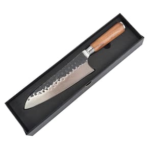 A faca possui um cabo de madeira e uma lâmina de aço inoxidável com marcas decorativas. Essa faca é versátil e adequada para uma variedade de tarefas na cozinha. Com seu cabo confortável e lâmina afiada, ela proporciona um manuseio preciso e seguro.
