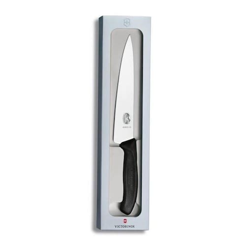 Comprimento total: 35 cm Comprimento da lâmina: 22 cm Cabo em polipropileno texturizado Lamina em aço inox Peso líquido: 119 g Origem: Suiça < Características > Qualidade Suíça Aço inoxidável de alta qualidade X50 CrMo Resistência: 55-56 HRC Afiação cônica em toda a extensâo da lâmina Dupla afiação Alto poder de corte. Teste de ângulo de corte à laser Empunhadura higiênica em Polyamid