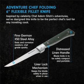 Faca dobrável de filé Messermeister Adventure Chef de 6” — Aço alemão e cabo de linho envelhecido — Resistente à ferrugem e fácil de manter —