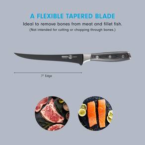 - LÂMINA COM UMA FINALIDADE - A faca de filé de 7” é uma ferramenta essencial para açougueiros e profissionais de churrasco. A faca foi projetada com uma lâmina cônica flexível para remover ossos de carne e filé de peixe com controle preciso e nitidez semelhante a uma navalha.