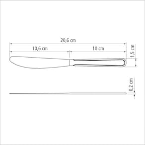 Para uma refeição saborosa, conte com a Faca de Mesa 4 polegadas Tramontina Búzios em Aço Inox! Inteiramente produzida em aço inox, ela possui espessura que garante um alto grau de durabilidade, podendo ser lavada na máquina de lavar louças, otimizando seu tempo e permitindo que passe mais tempo sua família. Seus pratos não estão sujeitos à arranhões, uma vez que seus métodos de produção não permitem que isso ocorra. Sua casa muito mais completa e linda com a Tramontina! Orientações Talher produzido em aço inox que mantém a beleza, a higiene e a durabilidade. Lâmina da faca tem maior durabilidade do fio devido ao tratamento térmico. Pode ir à máquina de lavar louças facilitando seu dia a dia. Observações Antes da primeira utilização, lave bem a peça e seque-a. Tenha cuidado ao manusear produto cortante e perfurante e mantenha-o fora do alcance de crianças. Para maior durabilidade do produto, recomenda-se secar bem antes de guardar, mesmo após lavagem em máquina.Para descarte do produto e embalagem siga as orientações de reciclagem vigentes. Características Gerais EAN13 7891112122840 DUN14 17891112122847 NCM 8211.91.00 Peso Líquido 0,0325 kg. Peso Bruto 0,0325 kg. Metragem 0,000012 m³. Dimensões Embalagem (Compr. X Larg. X Alt.) 205x 19x 3 mm.