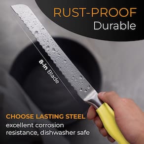 - ULTRA-AFIADA, CORTA SEM ESFORÇO: A lâmina da faca de pão serrilhada Orblue tem uma borda serrilhada ultra-afiada que agarra e fatia sem esforço os pães mais duros, para proporcionar um corte suave e limpo. A lâmina tem 8 polegadas de comprimento com uma alça de 4,9 polegadas. Incluído como medida de segurança adicional na ponta afiada da faca está um protetor de segurança de borracha.