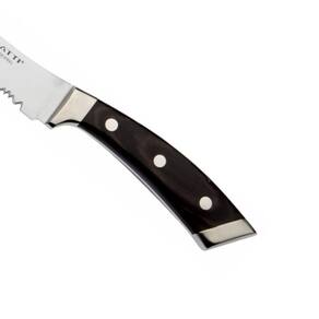 A faca de serra da Bugatti foi fabricada em liga de aço inoxidável com alto teor de carbono. O tratamento térmico confere à lâmina uma dureza que garante um corte ideal e uma longa vida do fio da lâmina. Produzida pela madeira nobre pakkawoud, inspirando o nome da linha, essa matéria prima tem o desenho natural das linhas da madeira clássica e é extremamente resistente, muitas vezes sendo utilizada em instrumentos musicais, o que traz o ar de sofisticação para a coleção. Designer: Virgilio Bugatti Material: Faca: Aço inoxidável forjado 18/10, liga de aço inoxidável com alto teor de carbono X30CR13 Cabo: Madeira pakkawoud Medidas: Altura: 33cm Largura: 3cm Peso: 260g Marca: Bugatti Garantia de 6 meses Sobre a Bugatti: A Bugatti é uma tradicional Marca Italiana, reconhecida mundialmente pelo alto design e qualidade dos seus produtos. A empresa se destaca pelo seu estilo único e inovador, combinando tecnologia com os valores da tradição artesanal e sua responsabilidade com a sustentabilidade ambiental. Ean: 802178966405