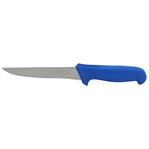 Faca Desossar 6 - Cabo Azul - Premium - Corneta - dimensões da peça: 28,5 x 4,2 x 2,6cm - dimensões da embalagem: 29,5 x 4,2 x 2,6cm - quantidade inner: 10 peças - dimensões inner: 30,5 x 9 x 9cm - quantidade master: 40 peças - dimensões master: 32 x 19 x 19cm - material: aço inox e pp - cor: Cabo: azul Lâmina: prata - tipo de embalagem: bainha - marca: corneta cutelaria - origem: fabricado na china sob supervisão técnica corneta do brasil. - espessura: 2,5mm - lâmina: 6 15,2cm - indicação: Indicada para retirar ossos, gorduras ou cartilagens das carnes. - características: Lâmina de 2,5mm de espessura estampada em aço inox recebendo tratamento térmico total. Cabo anatômico em polipropileno virgem. - atenção: Cuidados ao manusear produtos cortantes e perfurantes. Guarde em local seguro. Guarde estas instruções para futuras consultas. Manter fora do alcance das crianças. Fabricante corneta fabricado em aço inox. Cor cinza. Ean: 7896980412765