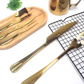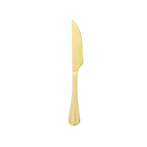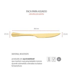 Faca Dourada para assados. Os utensilios de cozinha sao produzidos totalmente em aço inox de qualidade, com banho especial. Conchas, espatulas, garfos e colheres dourados sao peças classicas e elegantes na sua cozinha.