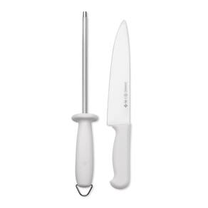 Faca e chaira branco master line mundial As facas da linha masterline 7800 são destinadas ao público doméstico e . Seu cabo foi desenhado para uma ergonomia perfeita, possibilitando movimentos variados com menor esforço. Além disso, possui proteção antimicrobial sanitized e cabo texturizado que ajuda na aderência e limpeza. Conjunto faca e chaira, composto por uma faca carne de 8" que garante segurança e precisão no corte e chaira de 8" indicada para alinhar e recuperar o fio da faca, mantendo-a afiada por mais tempo. Cor: branco Material: aço inox Medidas da embalagem: 42cm comp. X 4cm alt. X 15cm larg. Peso: 0,375kg Marca: Não Informado Ean: 7891060036121