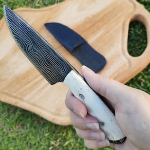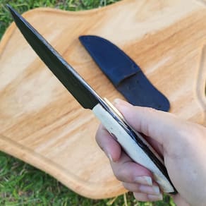 Faca EDC artesanal adequada para o uso diário, podendo atender atividades com ampla funcionalidade, no churrasco do final de semana, na carneada, no uso do campo e da cozinha. A lâmina é curva, facilitando a remoção de couro de animais sem perfurar a pele. Feita com 180 à 280 camadas de dois tipos diferentes de aço, torna a lâmina robusta e com fio realmente duradouro. As camadas de metais aquecidas são dobradas umas sobre as outras inúmeras vezes até formar uma única liga com desenhos incríveis na lâmina. É uma faca única, ninguém terá uma igual a sua. O tempo dedicado para a confecção de cada faca pode variar, levando em torno de dois dias de trabalho.