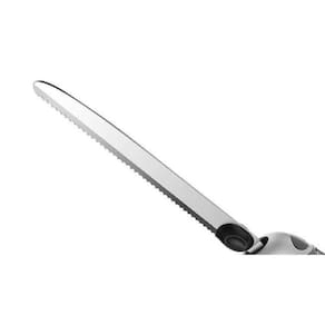 Sua lâmina dupla de aço inoxidável tem afiamento constante, não enferruja e corta desde os alimentos mais delicados, como frutas, legumes, frios e pães, aos mais consistentes, como carnes e alimentos congelados, até mesmo para desossar frango!