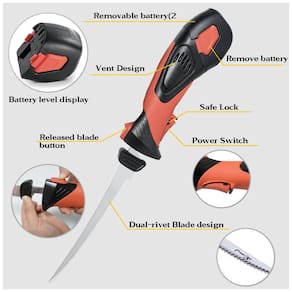 Eleve sua experiência de pesca com o Conjunto de Facão Elétrico Sem Fio da Pratuor. Este kit de qualidade profissional inclui cinco lâminas de aço inoxidável ultra afiadas e substituíveis, duas baterias recarregáveis e uma prática bolsa de armazenamento, garantindo que você tenha tudo que precisa para filetar sem complicações! Mantenha a ação com duas baterias recarregáveis substituíveis. Cada bateria oferece até 40 minutos de autonomia, permitindo que você processe de 15 a 20 peixes com peso entre 4,5 a 11,3 kg. As lâminas revestidas de Titânio oferecem versatilidade, com cinco opções de tamanhos para diferentes tipos de peixe, como crappie, badejo e atum. A empunhadura ergonômica com aderência antiderrapante e trava de segurança proporciona controle aprimorado e operação segura durante o filetamento. Além disso, o conjunto inclui uma bolsa de transporte de alta qualidade para facilitar o transporte de todos os acessórios.