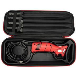 Faca elétrica em aço inoxidável com alça antiderrapante, lâmina de rebite duplo revestida em aço inoxidável TiN e gatilho ergonômico. Acompanha estojo de armazenamento com zíper.Infelizmente não temos estoque do produto que você está procurando no momento.