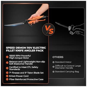 O Facão Elétrico KastKing Speed Demon 110v possui um motor AC potente de alto torque com 15500 rpm, permitindo cortes eficientes e precisos em carnes e ossos. Seu design equilibrado e ergonômico proporciona manuseio fácil, com um cabo de elastômero macio antiderrapante que reduz a fadiga durante o uso prolongado. Certificado pela ETL, garante máxima segurança e proteção térmica. As lâminas de titânio resistentes à corrosão garantem durabilidade e desempenho de alto nível. Inclui dois conjuntos de lâminas de aço inoxidável,atendendo a diversas necessidades de corte. Acompanha acessórios práticos, como cabo , estojo resistente à água e zíper para armazenamento e transporte fácil.