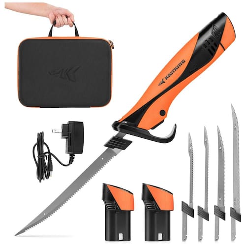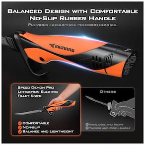 Desfrute de um processo de filetagem sem fadiga com o Facão Elétrico Speed Demon Pro da KastKing, que possui design ergonômico e balanceado. O cabo TPR macio e fino proporciona aderência firme e antiderrapante para controle preciso e segurança. Equipado com um potente motor de alta velocidade e alto torque, este facão elétrico oferece desempenho eficiente para uma filetagem rápida, suave e sem esforço, independente do tamanho ou espécie do peixe. Com uma bateria de lítio-ion de 12,6v, oferece impressionantes 1 hora e 40 minutos de uso contínuo com uma única carga. O Kit Guia inclui duas baterias para uso ininterrupto. Cada kit oferece lâminas de aço inoxidável 420 resistentes à corrosão, com revestimento de Titânio, incluindo lâminas. Acompanha um estojo personalizado EVA para armazenamento conveniente. Compacto e fácil de transportar em compartimentos de barcos, bagagens e mais.