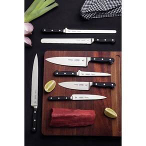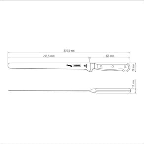 Para fatiar salames, copas, presuntos e demais fiambres a Faca para Fiambres Tramontina Century com Lâmina em Aço Inox e Cabo em Policarbonato 10 polegadas é a escolha perfeita. Desenvolvida especialmente para esses cortes, a Faca para Fiambres Tramontina possibilita a você fazer fatias perfeitas do seu alimento predileto. A lâmina em aço inox com tratamento térmico alia durabilidade e eficiência. Seu cabo em policarbonato com fibra de vidro tem acabamento anatômico, que permite destreza e segurança ao manipular o instrumento. Além de todas essas qualidades, ela ainda tem garantia de 25 anos contra defeitos de fabricação e pode ser levada à máquina de lavar.br /Ideal para cortar fatias finas de fiambres.br /A lâmina forjada de aço inox especial garante um fio com maior durabilidade e precisão. br /A lâmina possui tratamento térmico diferenciado, composto por têmpera, sub-zero e revenimento. br /E conta com dureza da lâmina de 55 e 58 HRC, que garante maior resistência do fio e precisão no corte. br /O cabo de policarbonato reforçado com fibra de vidro garante alta durabilidade, equilíbrio e segurança. br /O cabo ergonômico proporciona maior segurança, equilíbrio e conforto na hora do corte. br /Pode ir à máquina de lavar louças facilitando seu dia a dia.br /Antes da primeira utilização, lave bem a peça e seque-a. br /Produto cortante e perfurante: tenha cuidado ao manusear e mantenha fora do alcance das crianças. br /Para maior durabilidade do produto recomenda-se secar bem antes de guardar, mesmo após lavagem em máquina. br /Recomenda-se o uso de tábuas de polipropileno ou madeira da Tramontina para maior durabilidade do fio da faca. br /Não é indicado o uso da faca para o corte de alimentos congelados. br /Mantenha sempre sua faca afiada utilizando os afiadores da Tramontina.br /Para descarte dos produtos e embalagens siga as orientações de reciclagem vigentes.br /br /EAN13: 7891112004979br /DUN14: 17891112004976br /NCM: 8211.92.10br /Peso Líquido: 0,1380 kg.br /Peso Bruto: 1,1430 kg.br /Metragem: 0,000168 m.br /br /Dimensões Produto: Compr. X Larg. X Alt. : 377x 28x 15 mm.br /Cor 1: 000000 Hexabr /br /Dimensões: Compr. X Larg. X Alt. : 377x 28x 15 mm.br /Cor 1: 000000 Hexbr /br /Garantia do Fornecedor: 25 anos 90 dias de garantia legal, acrescidos de 24 anos e 09 meses de garantia contratual para vícios ou defeitos de fabricação.br /br /Linha Comercial: Century