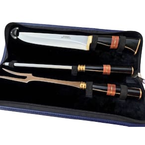 CJ CH 3 Conjunto 3 Peças Cabo Variado Conjunto modelo churrasco cabo variado CJ - CH 3 disponível em tamanho único de 8 polegadas em aço inox , produzido com a mais clássica modelagem de lâmina, tendo a espessura de 3 mm. Acompanha faca, chaira e garfo, o cabo é produzido com material natural de acordo com o a disponibilidade de . Não acompanha bainha, pois o mesmo é enviado em estojo. Medidas aproximadas: Faca - Lâmina 20,5 cm / Cabo 12,5cm / Total 33,0 cm Garfo - Lâmina 20,5 cm / Cabo 12,0 cm / Total 32,5 cm CH 8 - Lâmina 20,5 cm / Cabo 13,0 cm/ Total 33,5 cm
