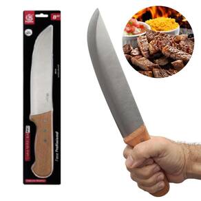 Faca 8'' cabo de madeira lamina reta, bom efeito visual e ótima para cortar carnes. Indicada tanto para quem corta na tábua quanto no espeto.