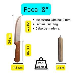 Faca 8'' cabo de madeira lamina reta, bom efeito visual e ótima para cortar carnes. Indicada tanto para quem corta na tábua quanto no espeto.