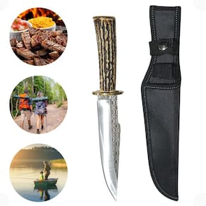 Faca lâmina inox desenhada cabo resina imitando osso com bainha