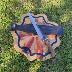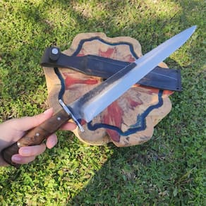 A faca javalizeira da D'Avila possui agora sua versão em brut forge, o modelo mais apreciado pelo apaixonados por itens de cutelaria. Produzida em aço carbono 1070, possui lâmina full tang de 5mm de espessura e acabamento robusto e resistente. Com empunhadura em diferentes madeiras nobres, possui ótima resistência às intempéries, torna esta faca artesanal uma peça única e exclusiva. Acompanha uma bainha em couro bovino.