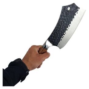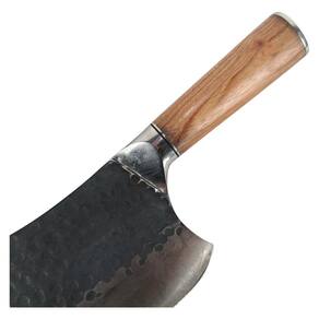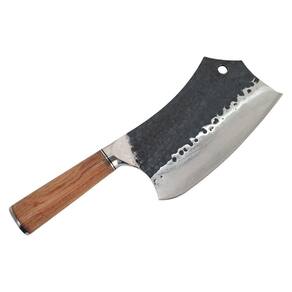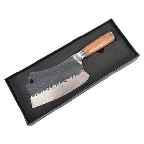 A faca possui um cabo de madeira e uma lâmina de aço inoxidável com marcas decorativas. Essa faca é versátil e adequada para uma variedade de tarefas na cozinha. Com seu cabo confortável e lâmina afiada, ela proporciona um manuseio preciso e seguro.