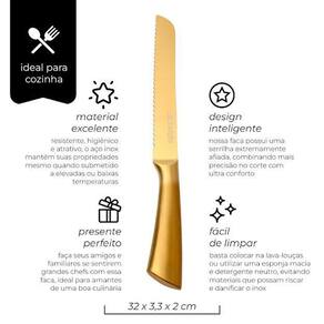 Faca p/pao serra inox dourada premium gold Cor: dourada Uma faca profissiona feita em aço inox com banho dourado é o que você esta precisando para transformar o jeito que você cozinha na sua casa, super fácil de se usar e realmente muito bonito este item vai fazer a diferença na sua cozinha. Elegância com a utilidade, super precisa e muito útil e vai auxiliar você a cortar carnes, legumes, peixes frutas e verduras com extrema eficiência e vai facilitar muito os seus preparos na cozinha Características / medidasDimensões: comprimento total 32cm comprimento da lâmina 20cm/ largura 3,3cm / espessura cabo 2mm Cor: douradaMaterial: aço inox Conteúdo da embalagem:Contém: 1 faca dourada com serrilha para pão. Cuidados:Não utilizar produtos químicos ou abrasivos na limpeza. Lavar com detergente neutro e esponja macia. Acesse nossa página de vendedor para conhecer todos nossos produtos casa hera maria casaheramariadecorhomeheramariastoreheramariafacadouradafacalegumesfacacarnesfacapeixesfacamultiusofacapão Dúvidas: Se atente a todas as características do produto, olhe as medidas, nome da cor, não se baseie apenas nas fotos e sim não deixe de ver a descrição para evitar comprar um produto que não atenderá sua necessidade, precisando só perguntar. Aqui seu é dinheiro garantido: Compra 100% seguraSe o seu produto chegar danificado, garantimos a devolução do seu dinheiro