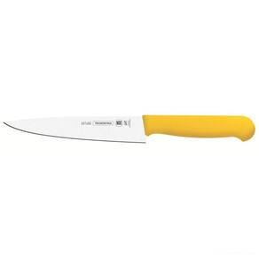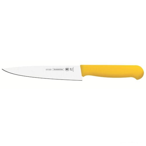 Faca para carne cabo amarelo Qualidade e durabilidade para profissionais que trabalham muito. Com tecnologia de ponta, as facas profissionais estão sempre preparadas para entrar em ação e fazer bonito com qualquer ingrediente. Eficiência é o que não falta. A altíssima qualidade das lâminas, resultado do tratamento térmico composto por têmpera (aquecimento da lâmina), subzero (resfriamento de 50 a 196 graus negativos) e revenimento (aumento da elasticidade do aço) garante vida longa e eficiente. A anatomia e ergonomia do cabo de polipropileno texturizado, injetado diretamente sobre a espiga da lâmina, oferecem segurança e conforto durante o manuseio. A proteção antimicrobiana inibe e reduz o crescimento de bactérias e fungos. Essa tecnologia é incorporada durante o processo de fabrição do cabo e dura por toda vida útil do produto, mas não não elimina a necessidade de lavá-los. Cabo de polipropileno com proteção antimicrobiana que inibe o crescimento de bactériase fungos. Cuidados com o produto Antes da primeira utilização, lave bem a peça e seque-a. Produto cortante e perfurante: tenha cuidado ao manusear e mantenha fora do alcance das crianças. Para maior durabilidade do produto recomenda-se secar bem antes de guardar, mesmo após lavagem em máquina. Recomenda-se o uso de tábuas de polipropileno ou madeira da Tramontina para maior durabilidade do fio da faca. Não é indicado o uso da faca para o corte de alimentos congelados. Mantenha sempre sua faca afiada utilizando os afiadores da Tramontina.Para descarte dos produtos e embalagens siga as orientações de reciclagem vigentes. Garantia 90 dias para vícios ou defeitos de fabricação.